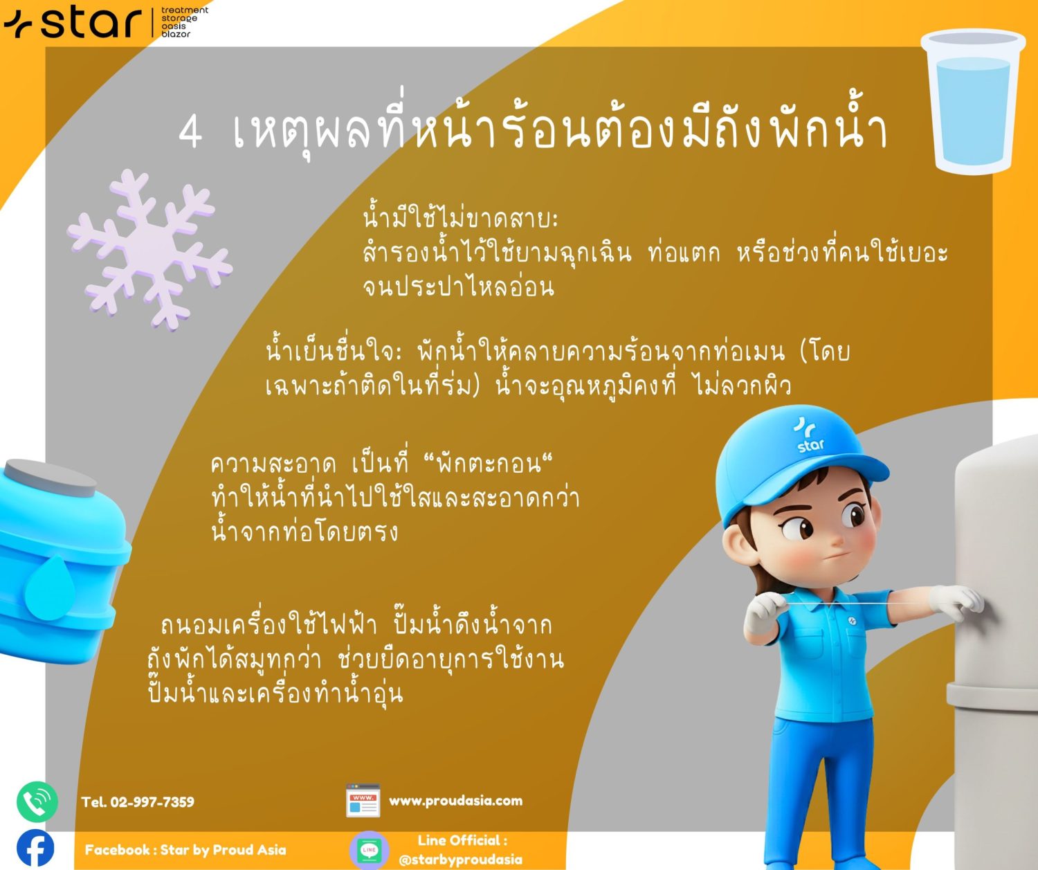 หมดห่วงเรื่องน้ำไม่ไหล: หน้าร้อนมักมีการซ่อมบำรุงท่อหรือการใช้น้ำพุ่งสูงจนแรงดันต่ำ การมีถังสำรองช่วยให้คุณมีน้ำใช้ทำธุระส่วนตัวได้แบบไม่สะดุด